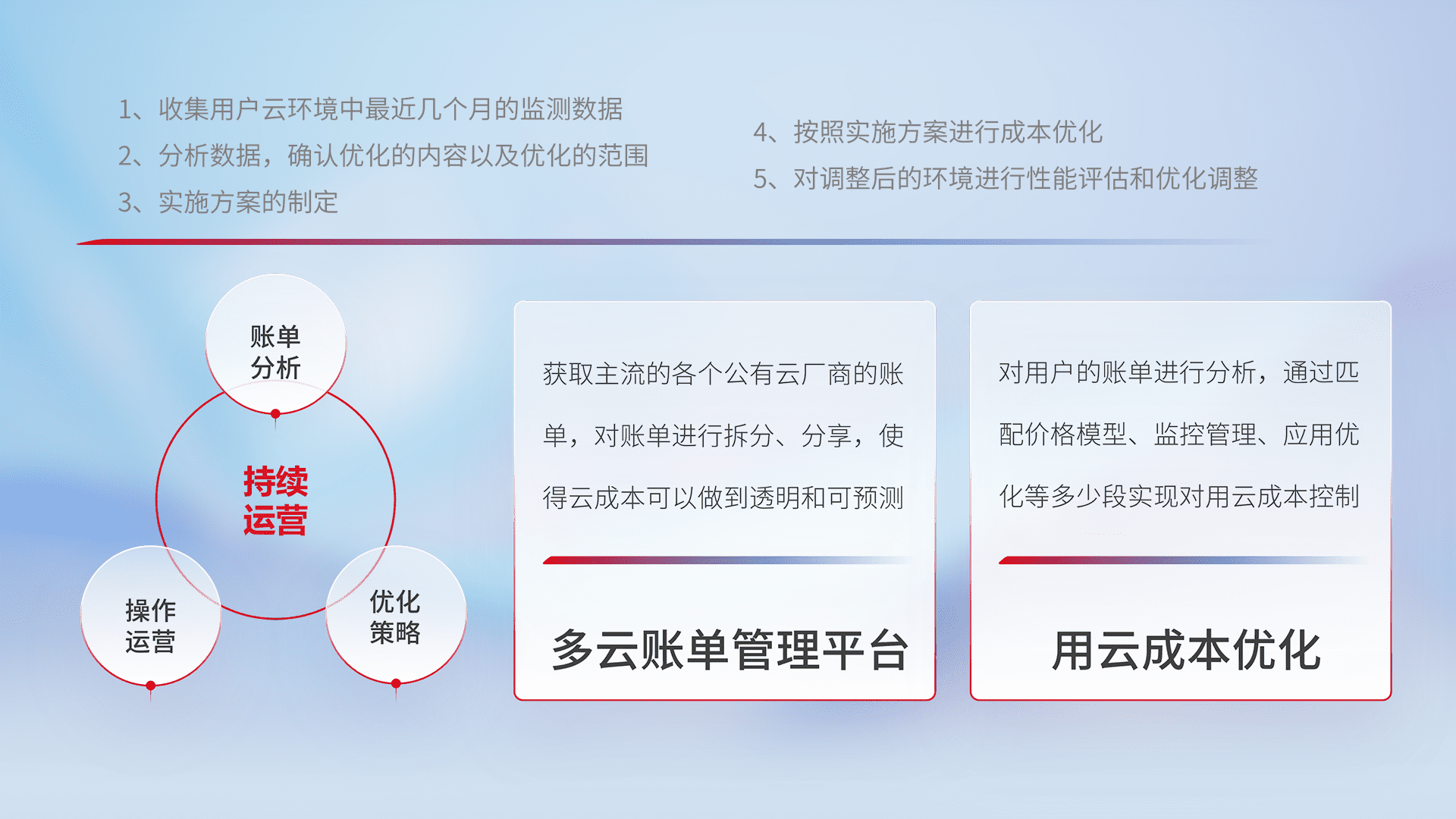 通过多云纳管,,,,以统一的资源数据模型把客户的云资源进行抽象和封装,,,进而实现对多云资源的统一操作,,,,保障云资源管理的可靠性、、稳定性与可用性。。量身定制化运维内容,,配置、、开发运维、、补丁管理、、、、备份、、、、监控、、、认证和访问管理、、、、审计和日常巡检等,,保障在用云过程中的可靠度,,,,稳定度以及高可用率。。。